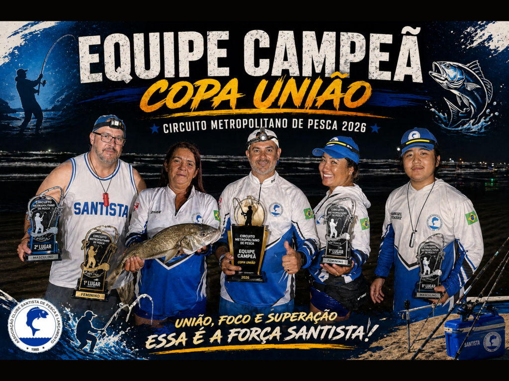 No dia 25/04/2026, o Clube Santista de Pesca e Lançamento brilhou mais uma vez e conquistou o título de Equipe Campeã da etapa Copa União, válida pelo Circuito Metropolitano de Pesca, realizada na praia de Bertioga/SP.
